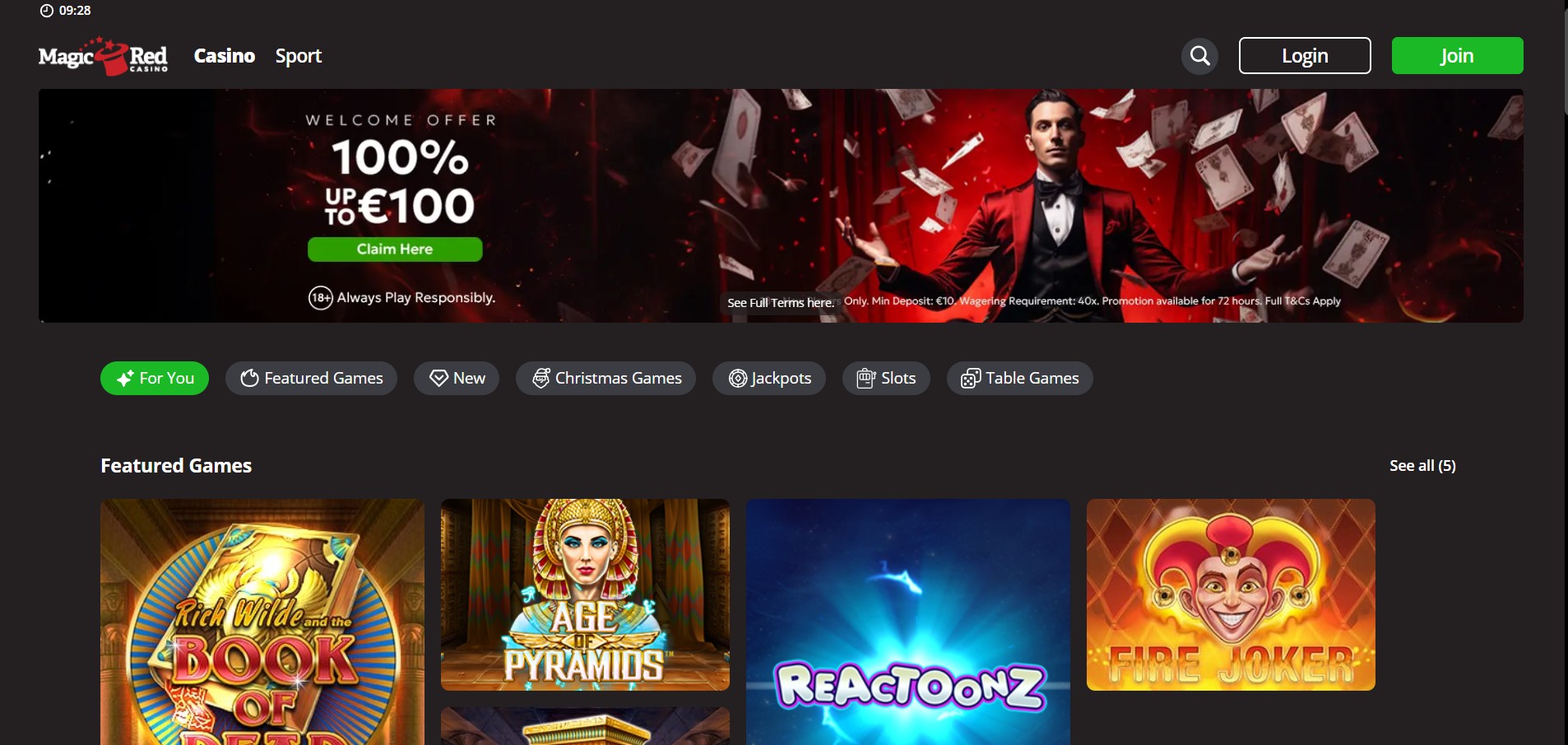 MagicRed Casino⭐⭐⭐⭐☆ (4/5)100% up to £100 + 100 Free SpinsLarge slot library & Slingo titles